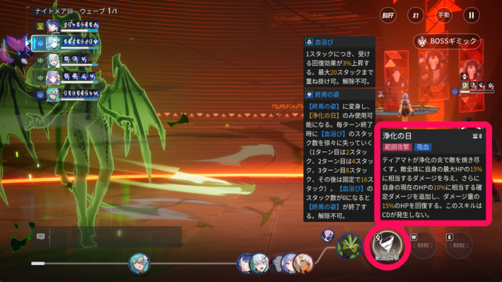 ![]() | スキルCD 0ターン最大効果 ティアマトが長槍を振りかざしてターゲットを突き刺す。敵単体に自身の最大HPの10%に相当するダメージを2回与え、毎回自身の現在のHPの8%を消費し、消費量の110%の確定ダメージを付与する。 進化の母:他の仲間のダメージを25%分担し、自身が累計で最大HPの13%を失うか回復させられるたびに、1スタックの【 【浄化の日】 ティアマトが浄化の炎で敵を焼き尽くす。敵全体に自身の最大HPの15%に相当するダメージを与え、さらに自身の現在のHPの13%に相当する確定ダメージを追加し、ダメージ量の20%のHPを回復する。このスキルはCDが発生しない。 |