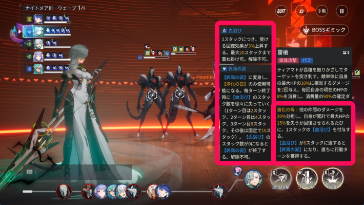 ティアマトのおすすめマトリックスは、荊棘や速度UPです。通常攻撃で反撃し血浴びのスタックを稼ぎましょう。