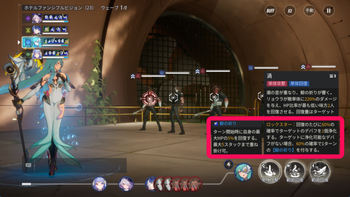 特性によってリョウラは回復時に対象にデバフが付与されていると自動で解除し、デバフが付与されていない場合は【