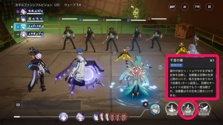 リョウラは通常攻撃時にHP比率が最低の味方を回復し、スキル2スキル3では味方全体に回復ができます。また味方全体のバフ効果延長や