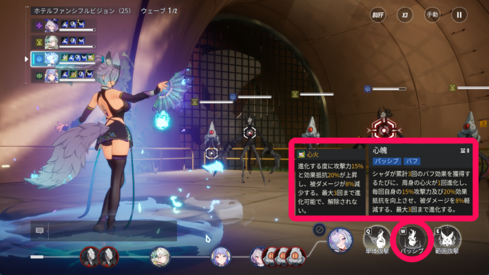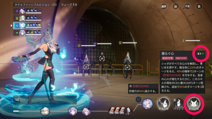 スキル3は防御力デバフを付与できる全体攻撃です。このスキルは【