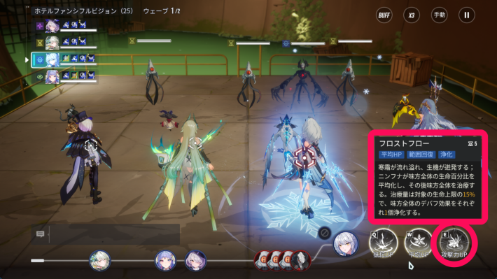 ニンフナはアタッカーをサポートする運用が強力です。攻撃的なサポートだけでなく、デバフ解除やシールド・回復ができる点も優秀。