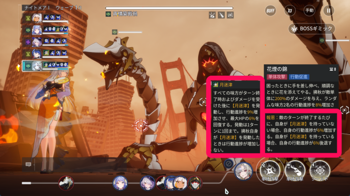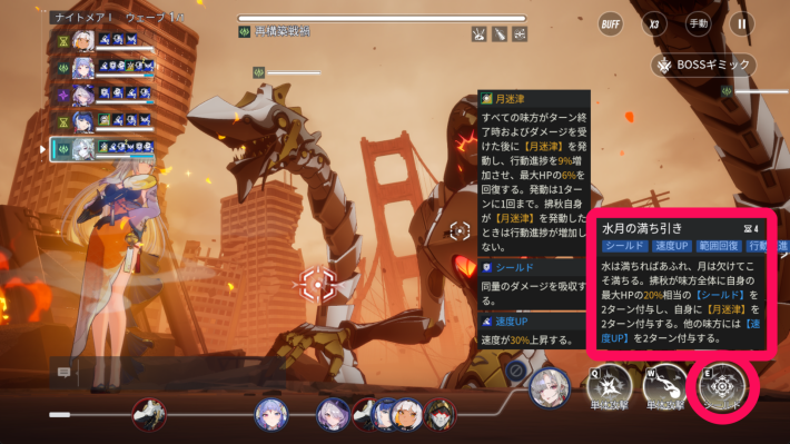 スキル2は発動時に確率で味方に月迷津を発動します。これは即時発動の行動進捗増加と回復の効果です。一方スキル3で自身に付与する月迷津は2ターンのバフで、味方ターン終了時と被弾時に発動します。