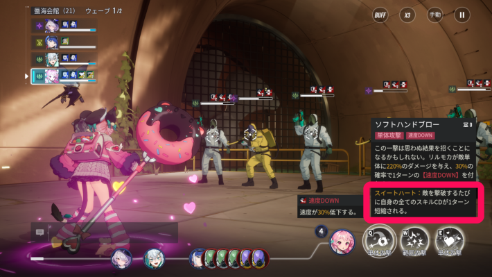 リルモカは敵を撃破すると自身の全スキルCDを1ターン短縮できます。元々短めのCDを更に短縮できるため、高頻度でスキルを使用できるキャラです。