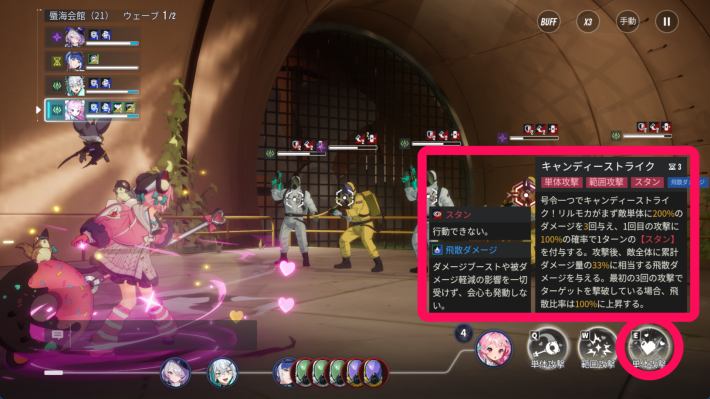 ![]() | スキルCD 4ターン最大効果 号令一つでキャンディーストライク!リルモカがまず敵単体に200%のダメージを3回与え、1回目の攻撃に100%の確率で1ターンの【 |