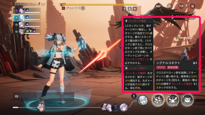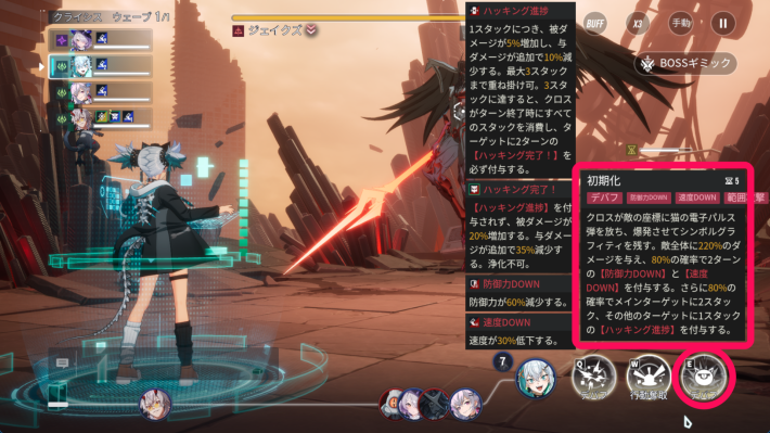 ハッキングデバフに加えてスキル3で防御力ダウンと速度ダウンを付与することもできます。複数種類のデバフに高い速度を持つことから、どのような編成でも安定して活躍できるデバッファーです。