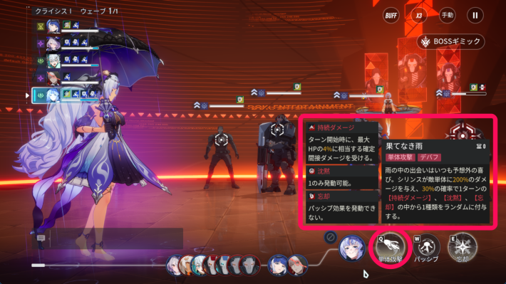 シリンスは通常攻撃時に確率で複数のデバフを付与します。