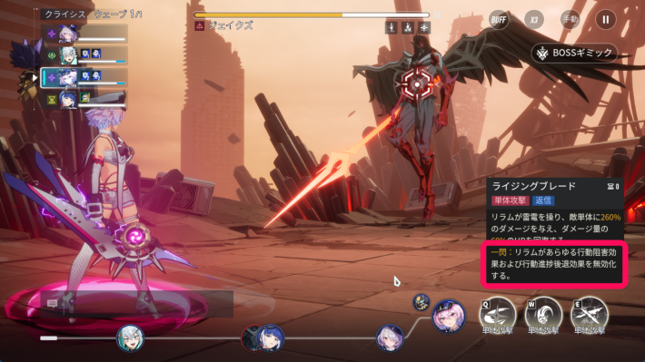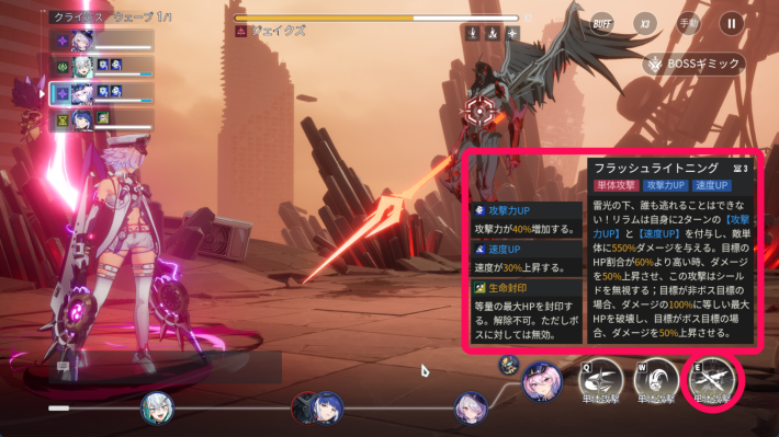 スキル3の単体攻撃は、対象が非ボスの場合は最大HP封印、ボスの場合は与ダメージ50%上昇と異なる効果を持ちます。