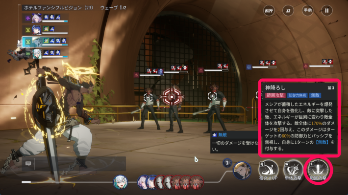 ![]() | スキルCD 3ターン最大効果 メシアが蓄積したエネルギーを爆発させて自身を強化し、敵に突撃した後、エネルギーが巨剣に変わり敵全体を攻撃する。敵全体に180%のダメージを2回与え、このダメージはターゲットの70%の防御力とパッシブを無視し、自身に1ターンの【 |
