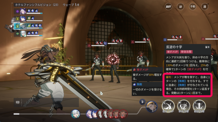 ![]() | スキルCD 0ターン最大効果 メシアが大剣を振り、斜め十字の方向に連続で2回斬りつける。敵単体に130%のダメージを2回与え、25%の確率で2ターンの【 審判:メシアが敵を倒すと、自身に1ターンの【 |