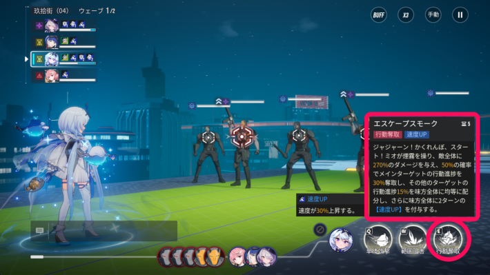 スキル3で味方全体に速度上昇バフを付与し、確率で敵全体の行動進捗を奪取します。味方の行動進捗を増加しつつ敵の行動進捗を後退できるため、相対的にかなりの量の行動進捗を増加できます。
