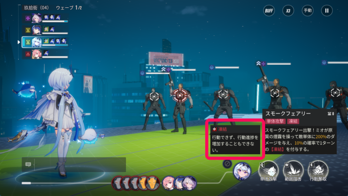 ミオは、敵の行動阻害に特化したキャラです。スキル1/スキル2では