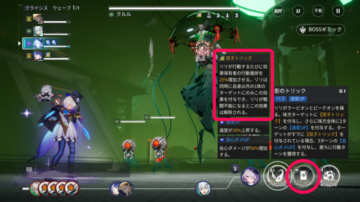 リリは、行動増加に特化したサポーターです。味方単体に【