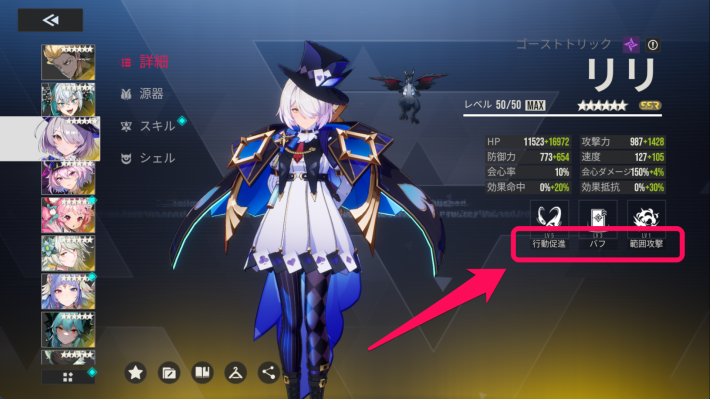 キャラのスキルアイコンの下にはそのスキルの主な効果を示した説明があります。攻撃が多ければアタッカー、バフや〇〇UP等があればサポーター、回復があればヒーラーのように判断できます。