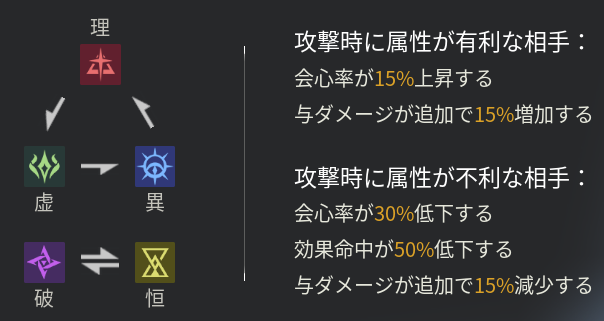 イザリアには属性相性があります。相性によって大きな有利/不利効果が発生するため、意識して編成を組みましょう。