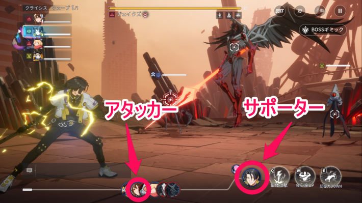 イザリアではキャラ毎に役割があり、バランスよく編成することでキャラの強みを引き出せます。アタッカー1人、サポーター2人、ヒーラー1人で編成するのが基本です。