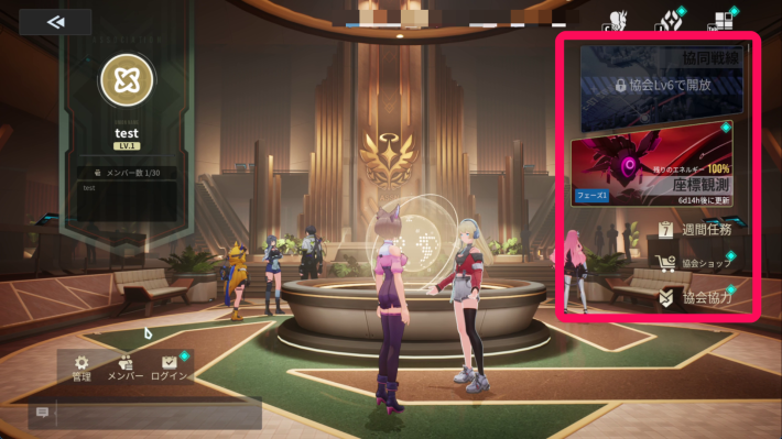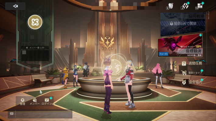 協会でできることはメニューの右側にまとまっています。戦闘コンテンツの「共同戦線」「座標観測」、協会に貢献するためのチャレンジ「週刊任務」、メンバー同士でアイテムの寄付ができる「協会強力」があります。