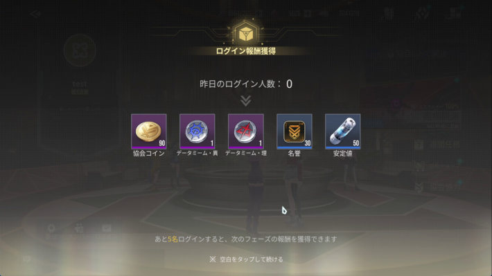 協会にログインした際や各コンテンツへの参加、達成時に石や強化素材等が入手できます。また、「協会コイン」というここでしか手に入らない専用通貨も獲得できます。