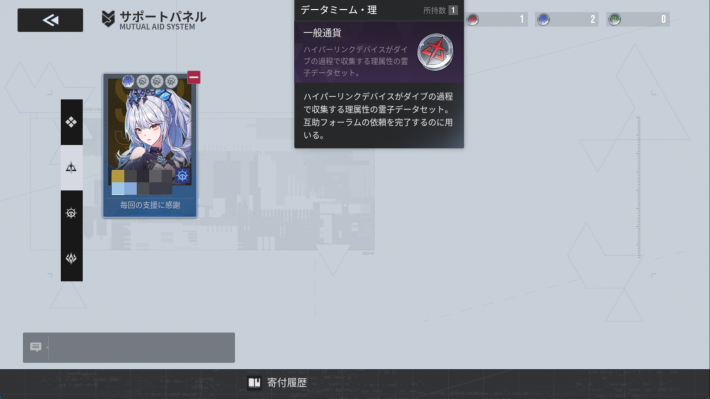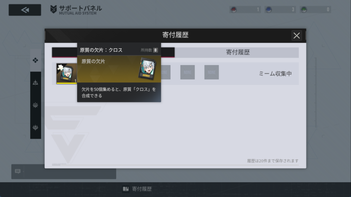 協会のデイリーログインで入手できる「データミーム」を消費することで、指定した所持キャラの原質の欠片(凸素材の欠片)が手に入ります。必要ないデータミームをメンバー間で寄付し合うことも可能です。