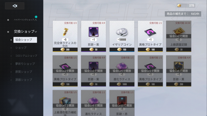 協会のコンテンツ報酬で手に入れた「協会コイン」を使用することで、協会ショップでアイテムを交換できます。貴重な育成素材やガチャチケットが獲得できるため、非常に大きなメリットです。