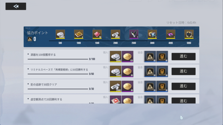 週間任務を達成することで協会レベルを上げるための経験値を獲得できるほか、専用ショップで使える協会コインやその他強化素材等の報酬を獲得できます。