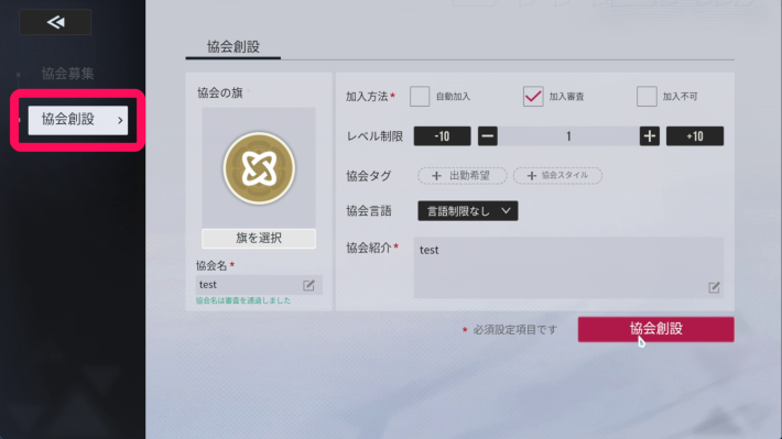 協会メニュー左側の「協会創設」タブから協会を設立することができます。必要事項を入力したら右下の「協会創設」を押して協会を設立しましょう。