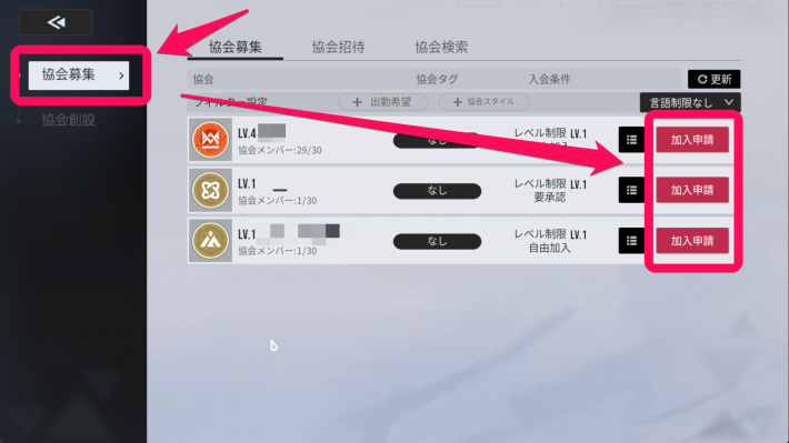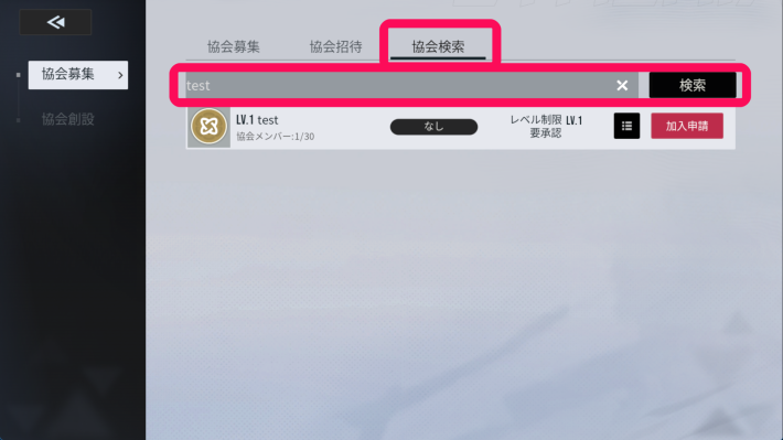 協会メニューの「協会募集」タブを選ぶとメンバーを募集している協会が表示されます。加入したい協会に「加入申請」を送ることで協会に加入できます。