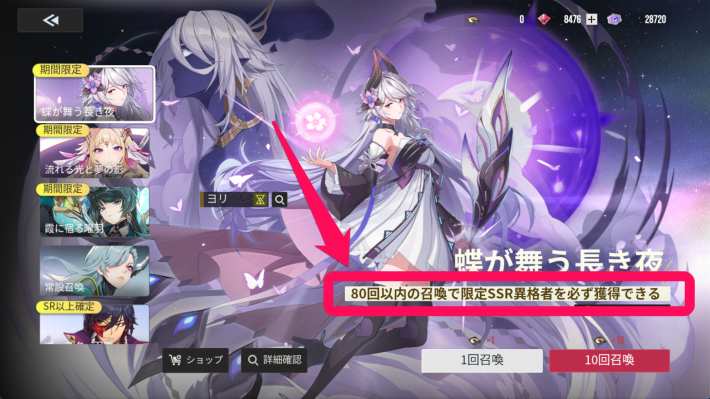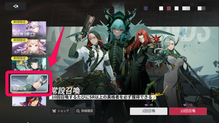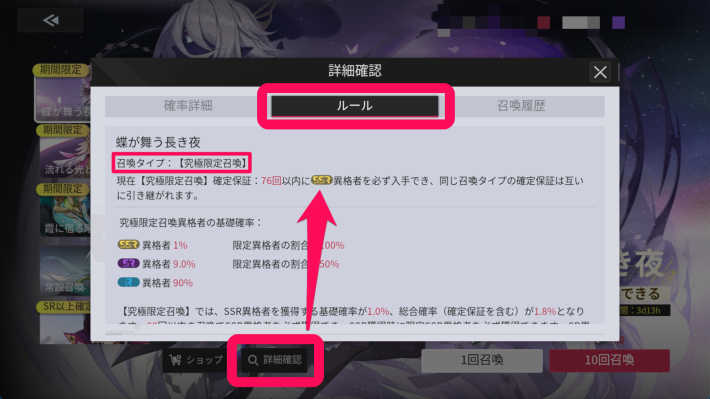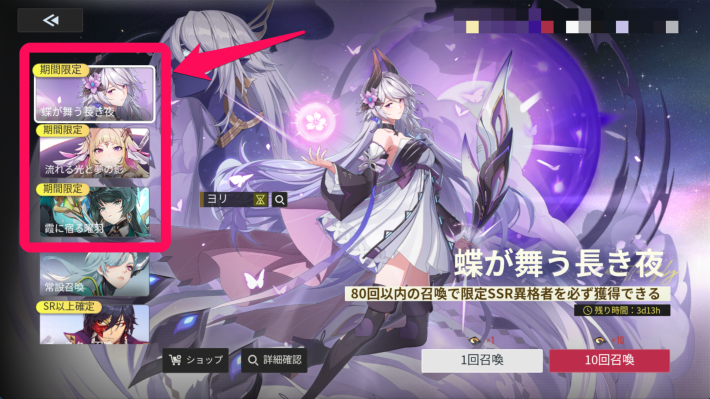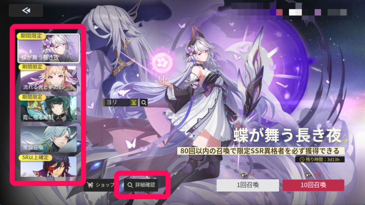 ガチャ画面では左のバナーを選択することでガチャを切り替えることができます。「詳細確認」からはピックアップキャラの詳細や排出確率、天井のルール等が確認できます。