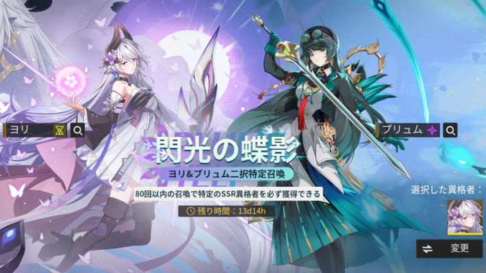 アカウント作成から14日間の間、ヨリかプリュムのどちらかを選べるガチャが開催。ヨリはアタッカー、プリュムはデバッファーの非常に強力なキャラで、確保できると非常に有利にゲームを進められます。