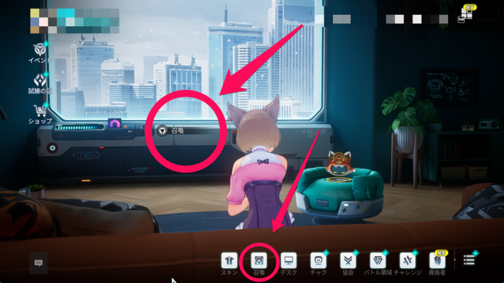 メニューを開かずに、ホームの窓際の「ガチャ」をタップまたは下側の「召喚」アイコンをタップすることでもガチャ画面にアクセスできます。