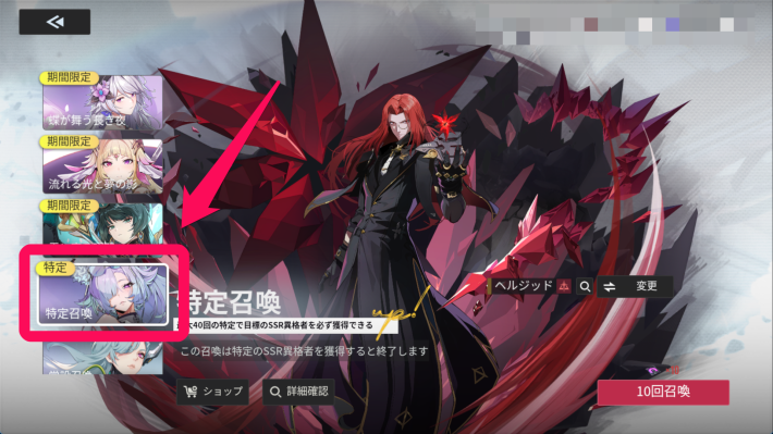 特定召喚は40連以内に必ず指定したSSRキャラを引ける一度きりのガチャです。全てのキャラが選択できるわけではありませんが強力なキャラも指定できるため、まずは特定召喚を引きましょう。