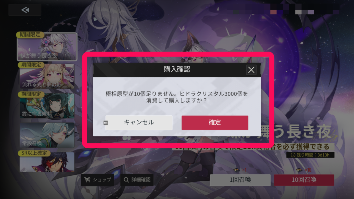 ガチャチケットが足りない時に召喚を押すと、石をガチャチケットに変える確認画面が出ます。確定を押すことで直接石を消費してガチャを引くことができます。