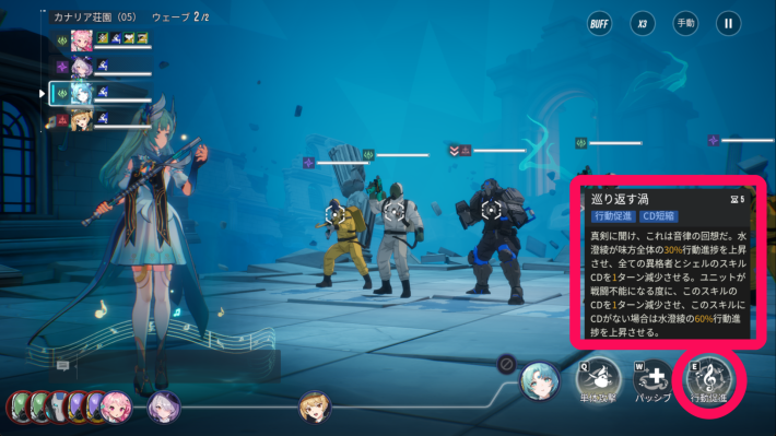 水澄綾はスキル3で味方全体の行動進捗を増加し、全てのスキルCDを短縮します。敵味方が戦闘不能になる度にこのスキルのCDを短縮し、CDが0の場合にこの効果が発動すると自身の行動進捗を増加できます。