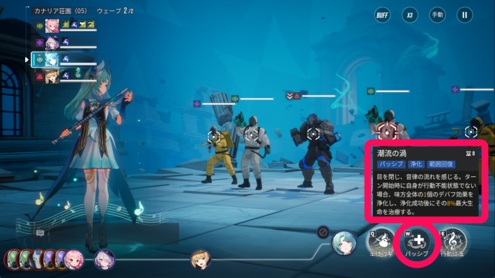 スキル2のパッシブ効果で水澄綾のターン開始時に味方全体のデバフを1つ浄化します。パッシブ効果でデバフの浄化に成功した時、浄化対象を最大HP15%分回復できます。