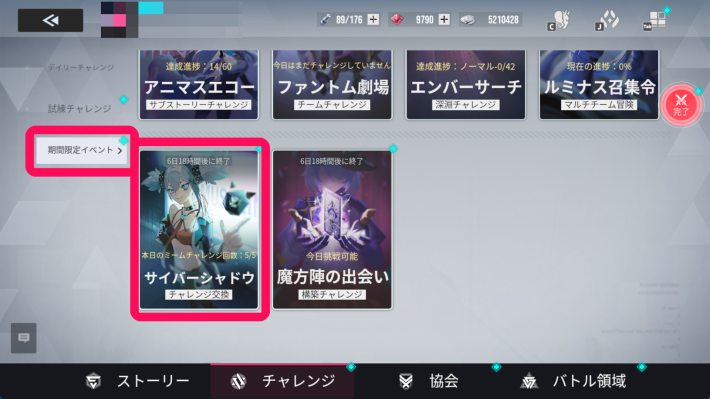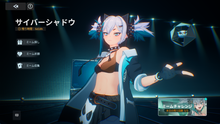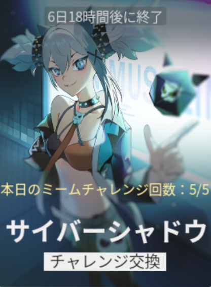 サイバーシャドウは、指定された異格ミームを集めることで報酬を獲得できるイベントです。ミームを獲得できるチャレンジは毎日5回まで挑戦できます。