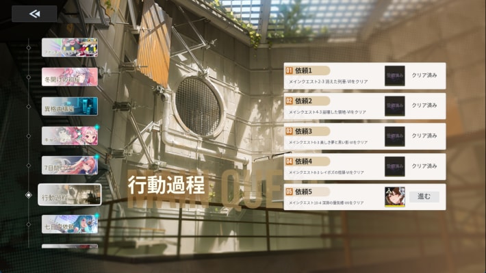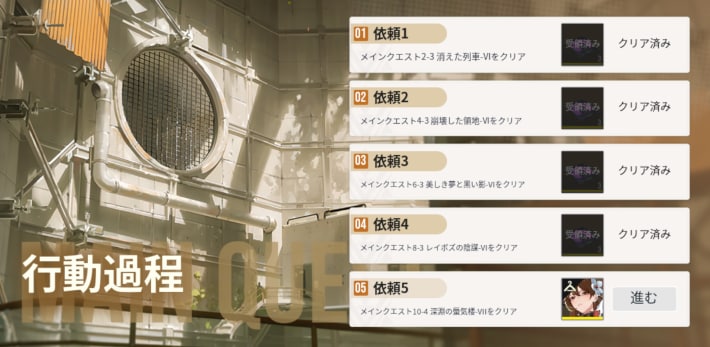 行動過程はメインクエストのクリアで報酬を獲得できる常設イベントです。現在公開されているメインクエストを全てクリアすることで煉のスキンを獲得できます。