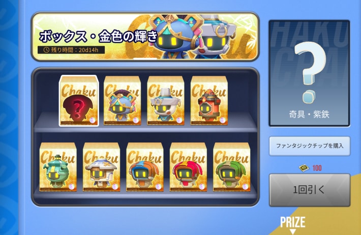 ファンタジックウィッシュマシン(ボックス・金色の輝き)は有料のチャクスキンガチャイベントです。ガチャ1回800円でランダムなチャクスキンを獲得できます。