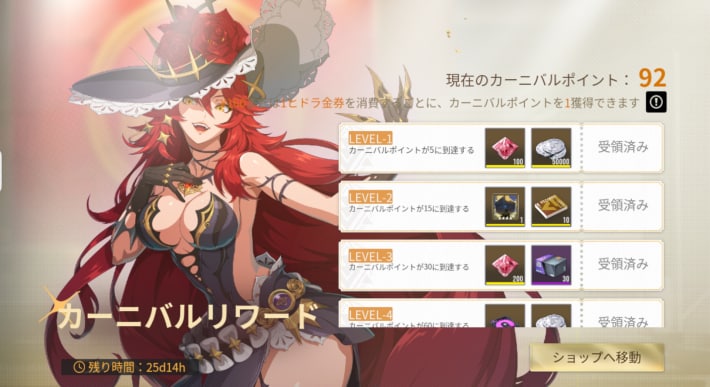 カーニバルリワードは期間中の課金額に応じてアイテムを獲得できるイベントです。160円もしくは1ヒドラ金券(OBT課金者への還元アイテム)を消費することで1ポイント獲得できます。