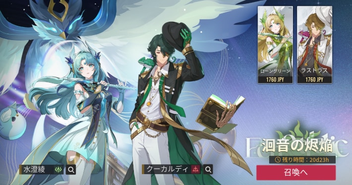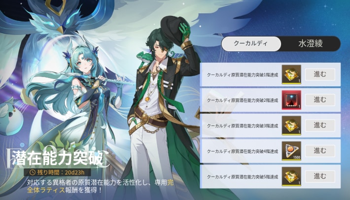 潜在能力突破はピックアップ中のSSR異格者水澄綾とクーカルディを凸することでアイテムを獲得できるイベントです。それぞれのキャラで個別の報酬を獲得できます。