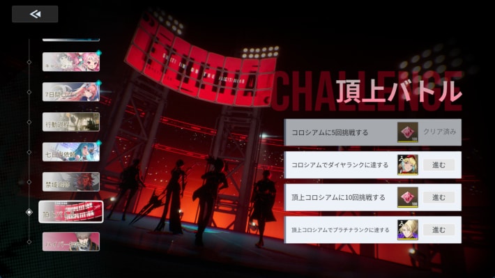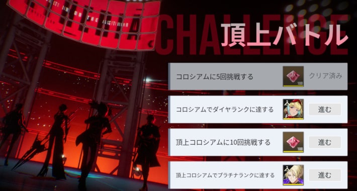 頂上バトルはPvPコンテンツのコロシアムに参加することで報酬を獲得できる常設イベントです。参加報酬でヒドラクリスタル、ランク到達報酬でキャラスキンを獲得できます。