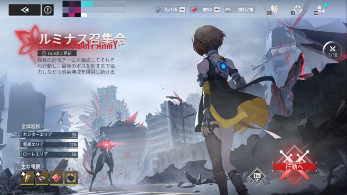 ルミナス招集令は3週間毎に更新される周期コンテンツです。5人部隊を3つ編成しノードを進めボスを撃破するのが目標の戦闘コンテンツで、ノードクリア報酬でクリスタルや育成素材を獲得できます。