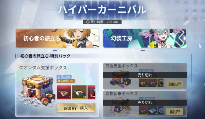 ハイパーカーニバルは限定課金コンテンツ案内のイベントです。限定のスキンやハイパーリンカーコスチュームが購入できます。また、期間中に1円でも課金するとSR異格者ヴァレリアンとガチャチケ10枚を獲得できます。