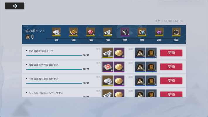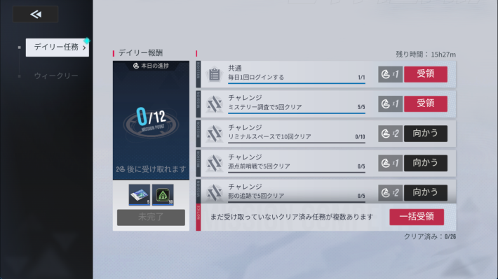 デイリー任務を達成することでポイントを獲得し、合計12ポイントで全てのデイリー報酬を獲得できます。達成すると次の段階の任務が表示されるものもあります。