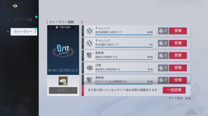 ウィークリーは毎週月曜日のAM5:00に更新されます。ウィークリーは量が多く直前に消化するのは大変なので、毎日デイリー消化後に進めるなど計画的に消化するのがおすすめです。