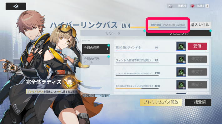 ハイパーリンクパスにもウィークリー任務があります。画面右上にであとどれだけEXPを獲得できるかが表示されているので消化の参考にしてください。
