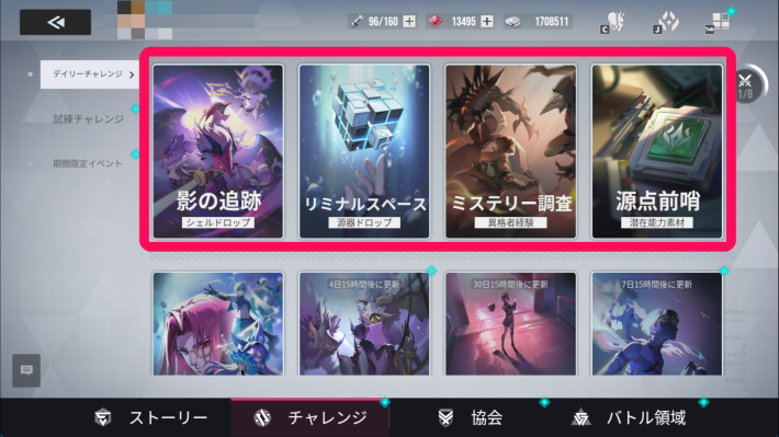 チャレンジクリア任務の中では影の追跡のみスタミナ効率が良いです。その他はキャラ育成を兼ねて好きなチャレンジでポイントを獲得しましょう。