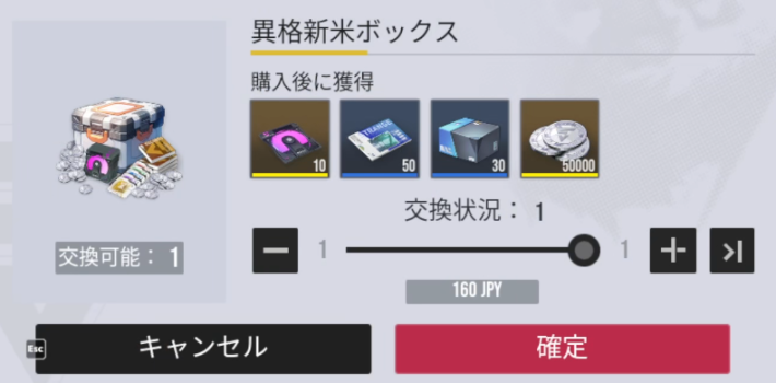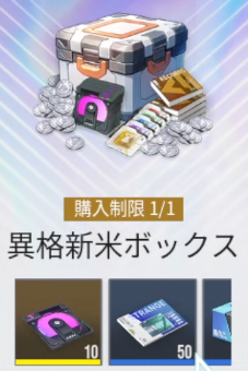 異格新米ボックスは一度だけ購入できる課金パックになります。非常に安価に異格プロトタイプと育成素材が手に入るお得なパックなためおすすめです。