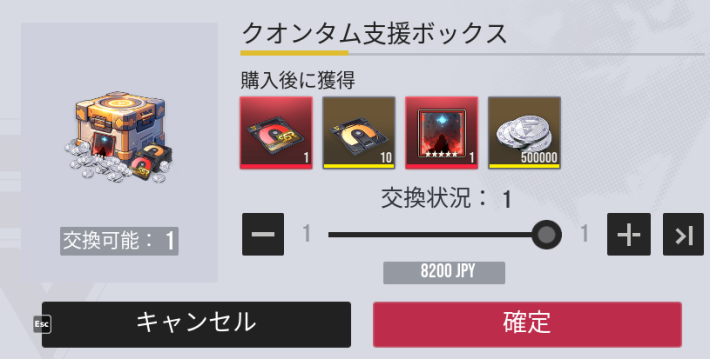|  ▼クオンタム支援ボックス | 【おすすめ度】★★☆☆☆ 【購入回数】1回 【主な内容物】 SSR確定ガチャチケ 極相原型×10 【値段】8200円 |