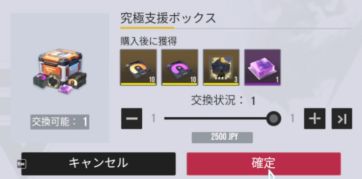 |  ▼究極支援ボックス | 【おすすめ度】★★★★☆ 【購入回数】1回 【主な内容物】 極相原型×10 異格プロトタイプ×10 【値段】2500円 【販売期限】10/02 13:59まで |