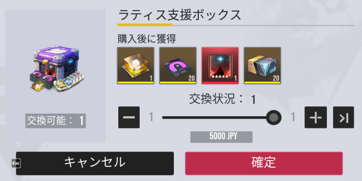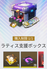 |  ▼ラティス支援ボックス | 【おすすめ度】★★☆☆☆ 【購入回数】1回 【主な内容物】 完全体ラティス×1 異格プロトタイプ×20 【値段】5000円 |